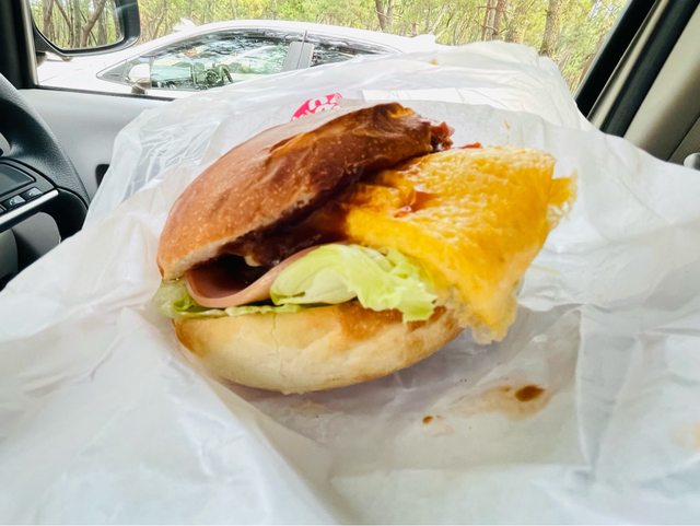 內容物有蛋、培根、漢堡肉,麵包外酥內嫩肉汁多還有一點點微微辣很美味,比我在佐世