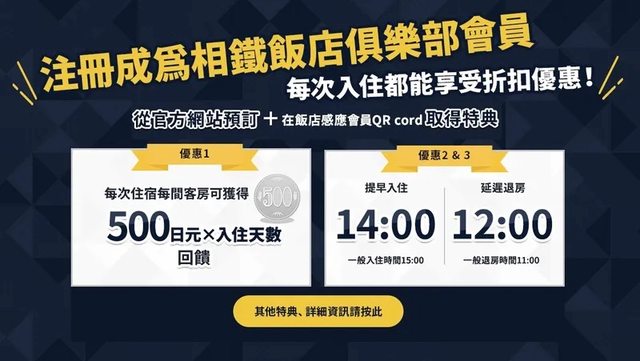 成為官網會員不只可提早入住、延遲退房,更推出每住一晚就有 500 日圓現金回饋的返