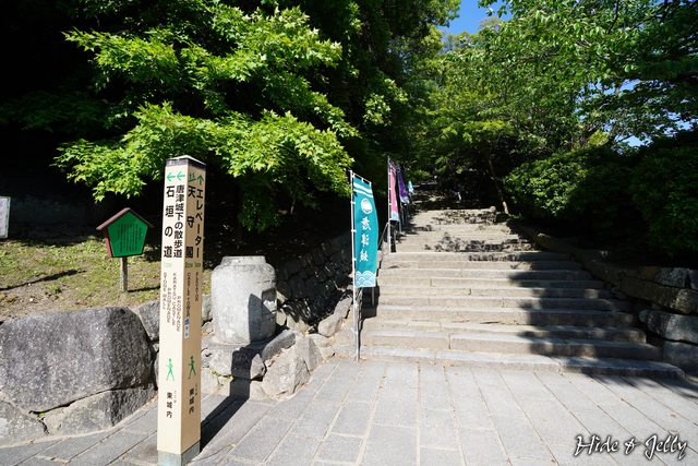 城的登城口。中央的石階梯可登上本丸區域,但如果不良於行,可以搭乘左側的電梯登城