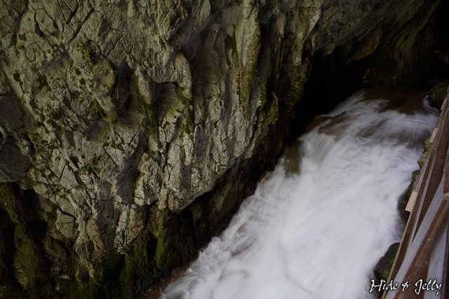 木棧橋跨過瀑布的上方,原來這裡叫做「竜ヶ淵」(龍淵,下圖),龍淵之後,就是秋芳洞