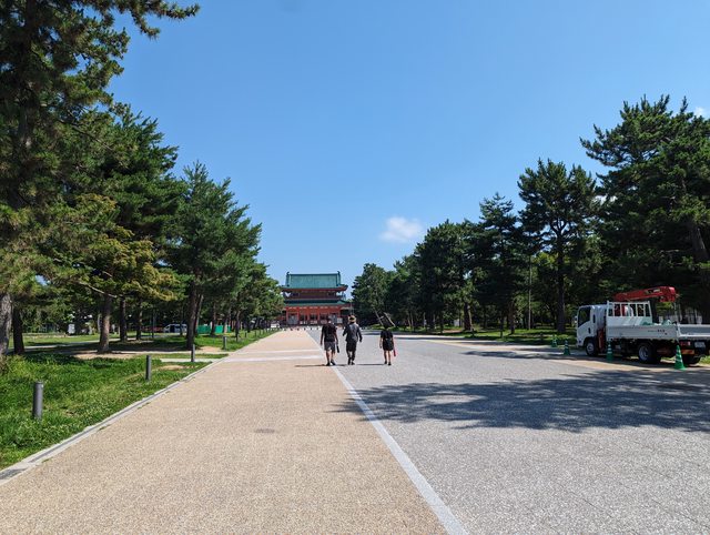 巨大紅色鳥居相當壯觀,參道也相當寬闊 通過正門後是一遍白沙地,很少有占地如此廣闊的神社 這裡供奉的是桓武天皇,紀念千年前遷都平安京 收集到兩個朱印