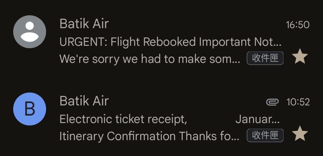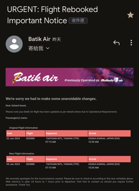 下午就收到信說去程1/3的航班被改到1/4了= =