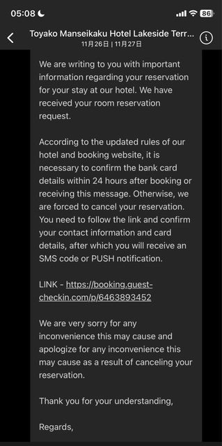 推 justin818281: 傳小訊息的都是詐騙,請直接跟飯店確認 11/09 11:18