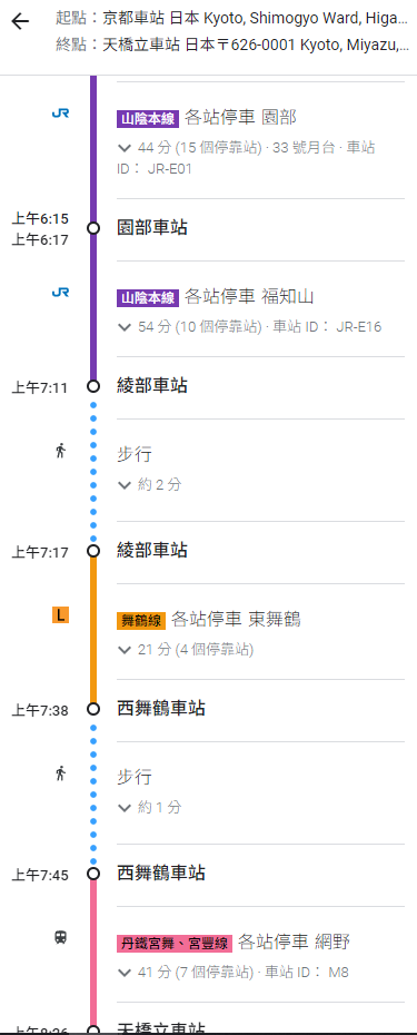 → angus449 : 發轉三次車8:32到天橋立,您可以參考看看。還有, 11/12 04:14