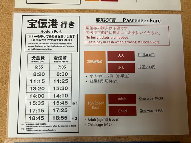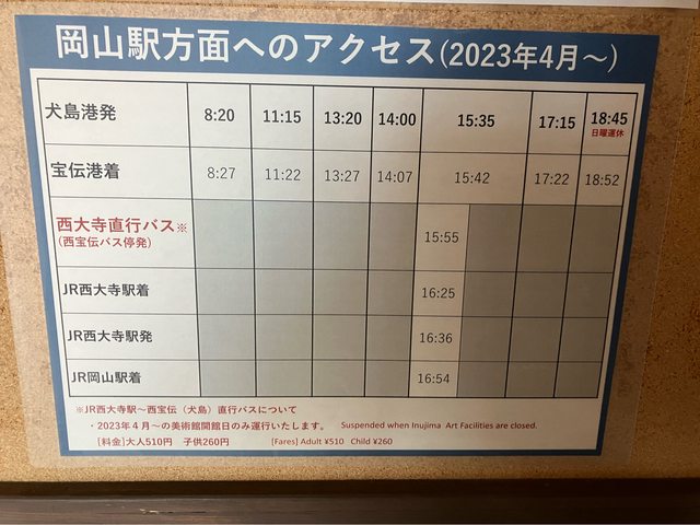 現在正在犬島上等待回程航班的時間,分享一下拍攝到的最新時刻表,犬島真的非常值得