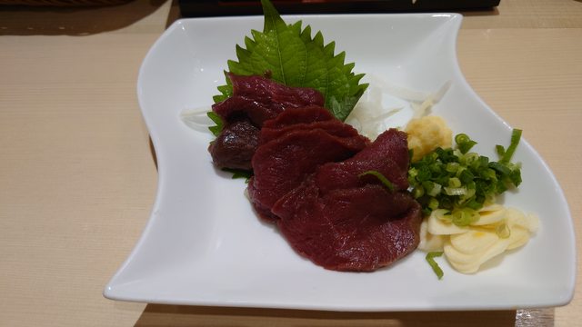 馬肉刺身的味道嘗起來跟生牛肉有點像,不過咬起來更有彈性;