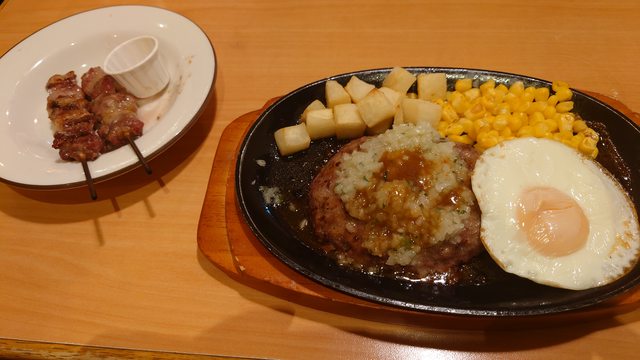 剛好這次來日本還沒吃到漢堡排,就點了洋蔥漢堡排組合、羊肉串加自助吧,
