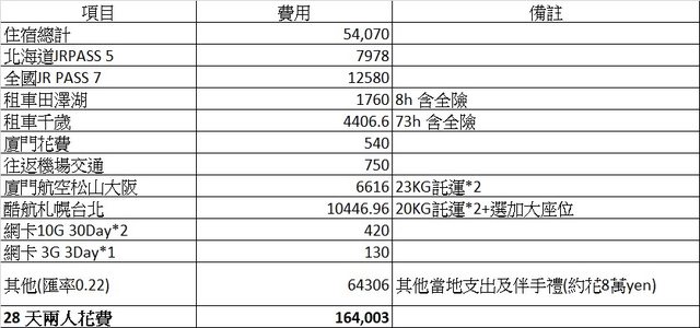 關西到北海道的28天行程花費,2人總共花費164003 (含伴手禮)