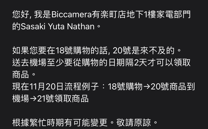 → jade5913 : 號的成田機場來不及,現在好像要留3個工作日才夠喔 11/20 18:09