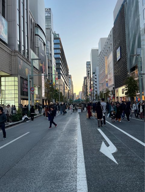 假日的銀座都會推一小段路可以在馬路中間喝咖啡,叫步行者天國,天氣好的話大樓跟天