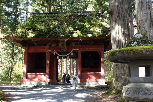 將車停好後,穿過奧社入口的大鳥居,沿著兩邊種滿楓樹的長長參道爬坡上去,