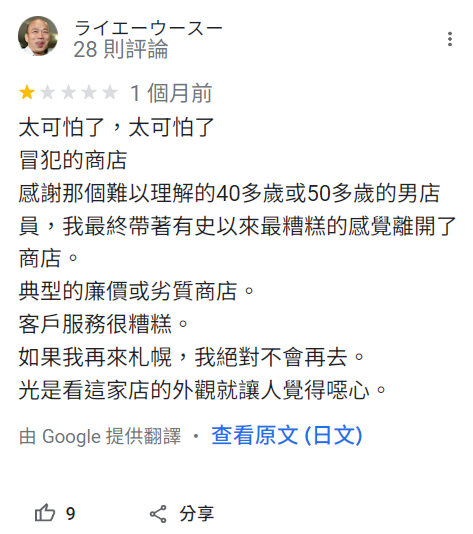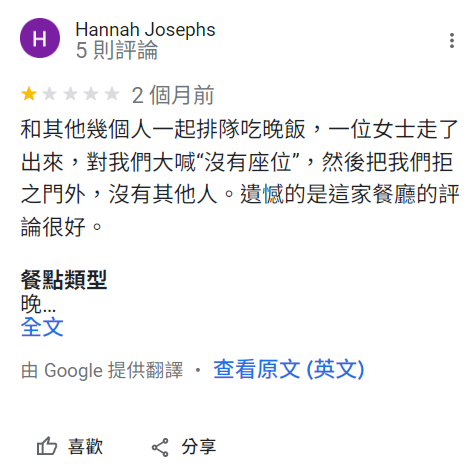 推 dickec35 : 我看到google低星理由比較多是服務態度不佳 11/24 01:25
