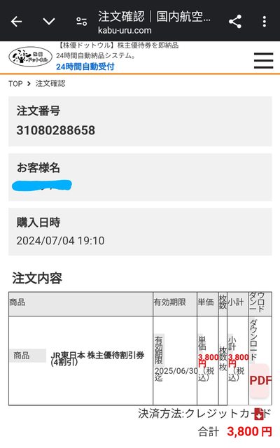 JR東日本 株主優待割引券(4割引) 2024/07/01-2025/06/30 3800円 ? 1