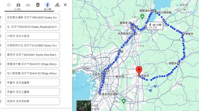 想要從關西機場騎到大阪,京都,然後經過琵琶湖,參觀甲賀乙賀,然後從奈良回大阪,