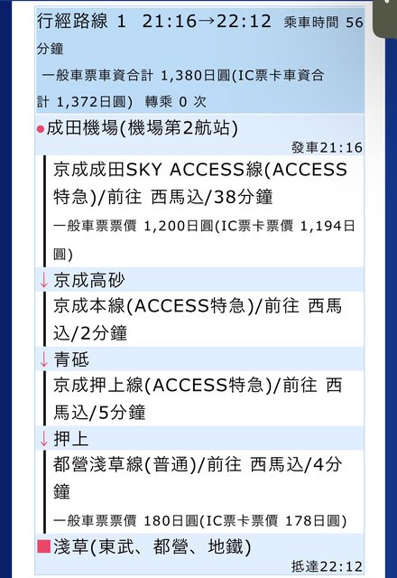 (1) Day1 查詢到的成田機場往淺草交通如下圖,車種是ACCESS特急轉都營淺草線(普通),?