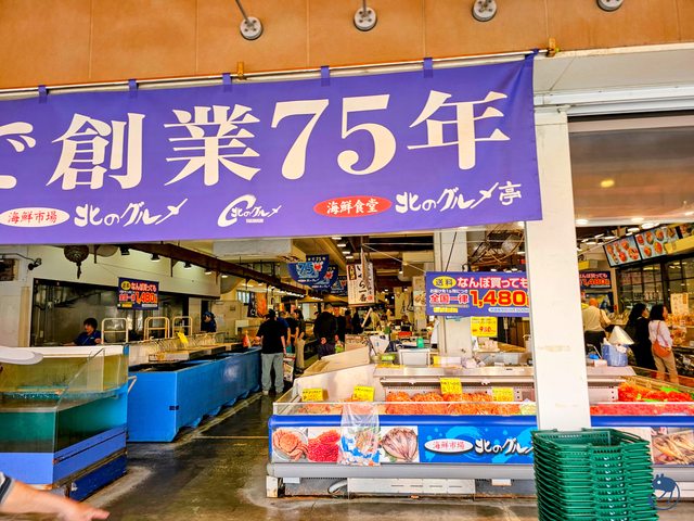 昭和24年(1949年)創立的海鮮市場 北のグルメ(北之美味)是場外市場中的老店,除了一