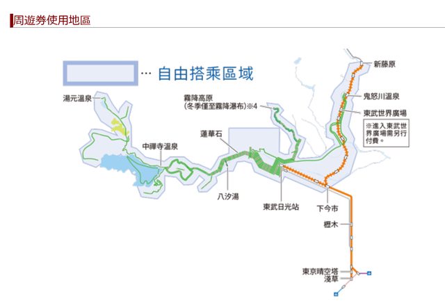 1.下今市~東武日光、新藤原間的東武鐵道全線可自由上下車