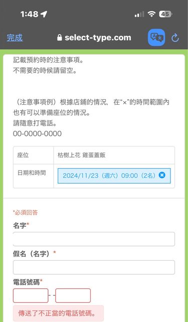 是這樣的,想訂一間生雞蛋拌飯,採預約制,電話為必填欄位,無法以備註方式填寫,懇