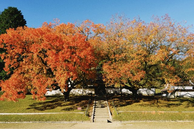 日本最古庶民學校,孔廟前方兩棵大楷樹的紅葉狀況非常美。