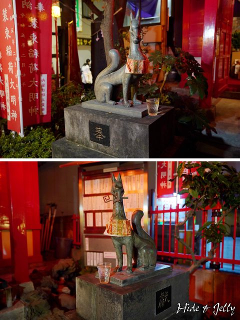 本殿兩旁都有威風凜凜的狐狸雕像,體態修長,嘴裡都叼著法器,與一般看到的稻荷狐狸
