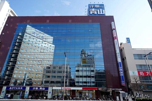以先看到倒映在整面玻璃帷幕前的飯店了。這間洋服的青山根本完全就在幫東橫INN打廣