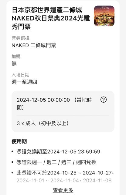標題[讓售] 12/5二條城NAKED秋日祭典光雕秀門票*3