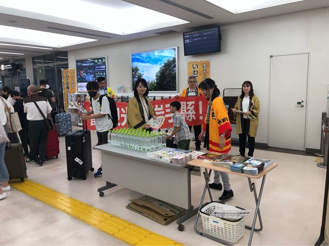 工作人員拉著紅布條接待,並一人發一瓶礦泉水,也有一些旅遊資訊可以拿,相當地用心