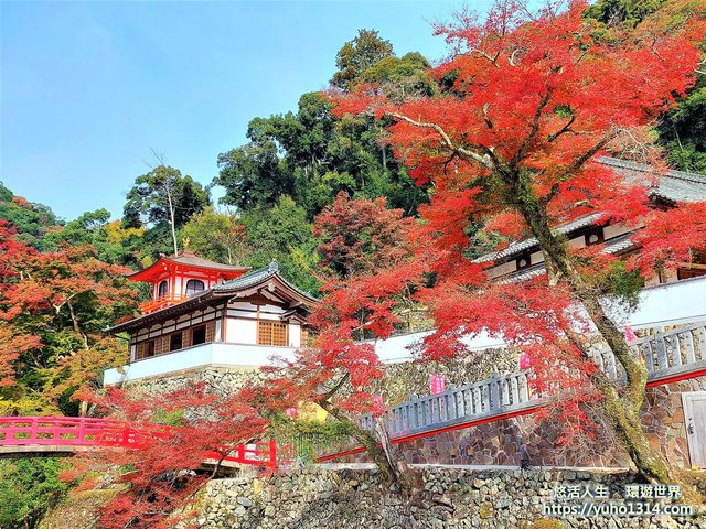 經過寺廟,紅楓搭配廟宇建築與紅色的橋樑也很美,沿途好像欣賞大自然美麗不同顏色的