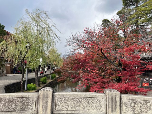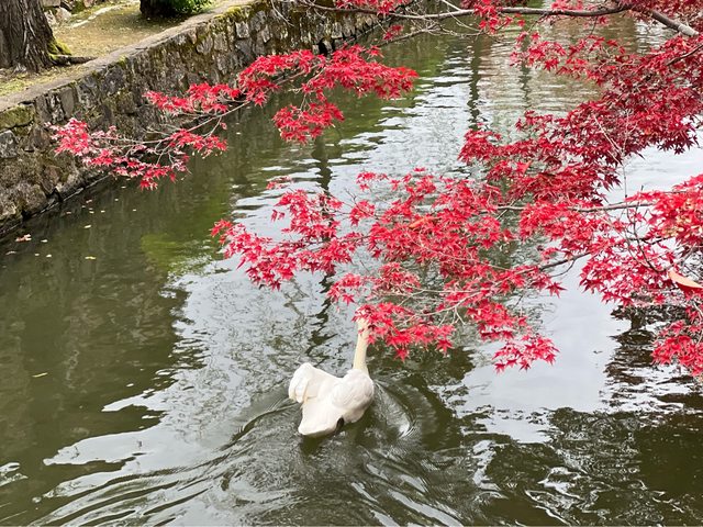 大原美術館前面的河川有飼養兩隻天鵝,現在紅葉很美,可以拍出美照!