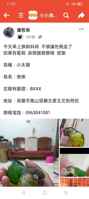 昨天6/26(二)換飼料時不慎讓鳥寶飛出去 如有看到 請跟我聯絡 謝謝!