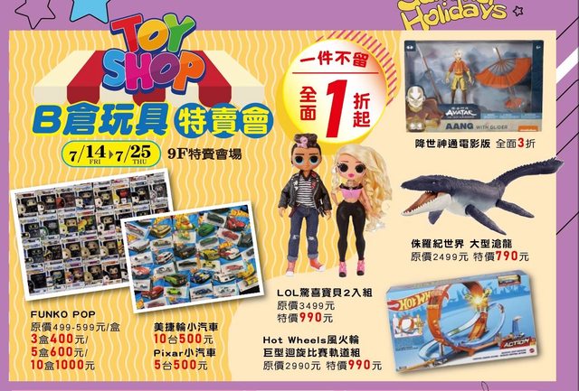 店 家:玩具特賣會 日 期/時 間:即日起-7/25 地 點:高雄市苓雅區三多四路21號9樓(高雄大遠百9F) 來源 or 網址:https://nickhow.tw/khtoy/ 內容 or 商品: https://i.imgur.com/pzOZfa8.jpg
