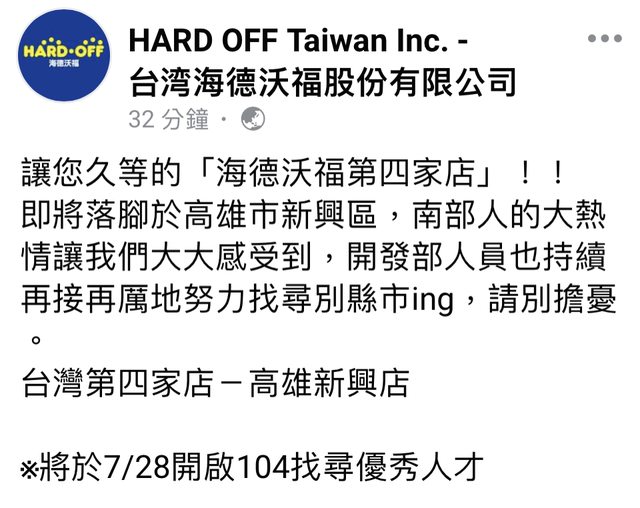 讓您久等的「海德沃福第四家店」!! 即將落腳於高雄市新興區,南部人的大熱情讓我們大大感受到,開發部人員也持續再接再厲地努力找尋別縣市ing,請別擔憂。 ———— 日本最大二手連鎖店也要來高雄了,7月28日開始徵才,可以不用再跑台南了(不過也可以順道去武聖夜市就是了) 有沒有大大已經知道會開在新興區哪裡嗎? ----- Sent from JPTT on my iPhone -- ※ 發信站: 批踢踢實業坊(www.ptt.org.tw), 來自: 36.228.233.101 (臺灣) ※ 文章網址: https://www.ptt.org.tw/Kaohsiung/M.1690178033.A.73B