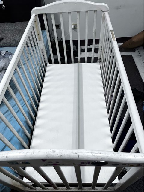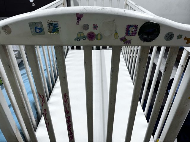 嬰兒床床邊有貼紙跟塗鴉痕跡