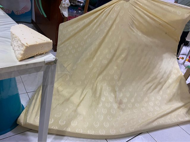 外層緹花布有洗過,上面的污漬是小孩流鼻血洗不掉的痕跡