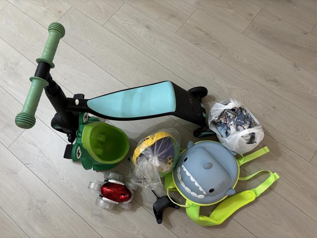 物品名稱:兩用滑步車(可變滑板車)、小青蛙小便斗、學習褲數件、搖控車、自動泡泡機、鯊魚後背包