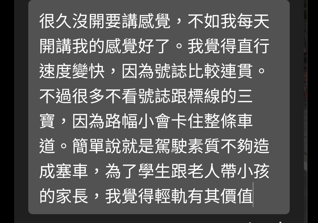 → hantulee : 建議你多搭搭公車,聽聽公車司機的抱怨 10/22 15:10