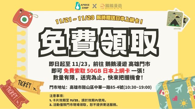 即日起至 11/23,前往 鵝鵝漫遊 高雄門市,即可免費索取 50GB 日本上網卡 一張!