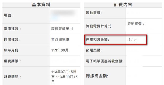 但這次山陀兒颱風停了2x小時,當期電費單卻沒有停電扣減的項目。