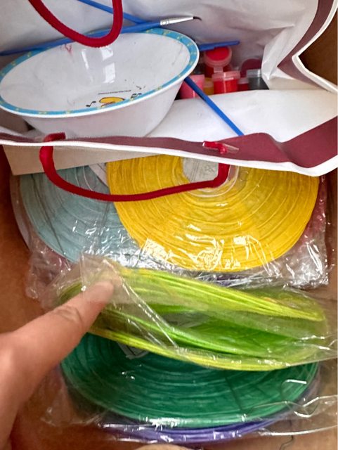 有許多小燈籠、還有水彩及畫筆