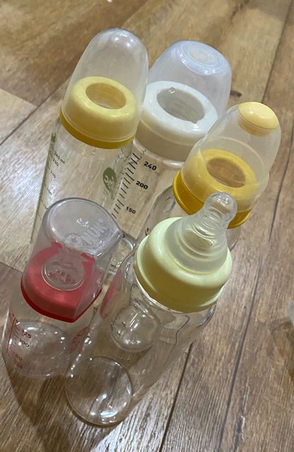 3.二手奶瓶:3隻標準口玻璃240ml+1隻寬口玻璃240ml+1隻125ml塑膠,不附奶嘴