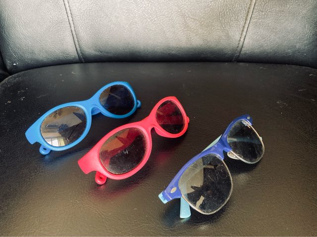 兒童墨鏡3個(2-6歲適用),小孩點長效散瞳搭配使用,藍跟紅是迪卡儂買的,另外一個