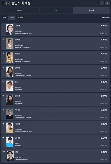 另外,《與惡魔有約》的金裕貞排名第6位(2.64%),《京城怪物》的朴敘俊排名第7位(2.