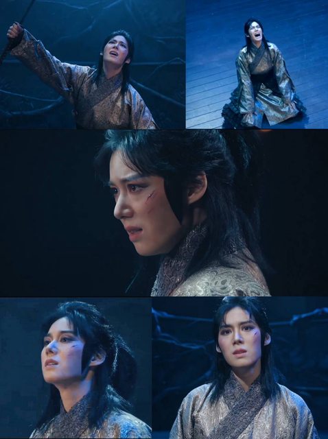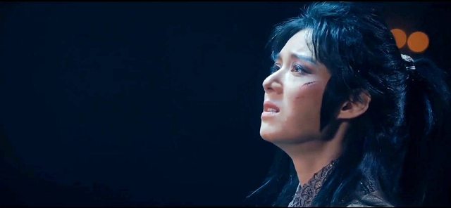 舞台的燈光灑落在溫達負傷的臉上, 悲痛欲絕的神情、滑落臉龐的淚滴,整體畫面的美