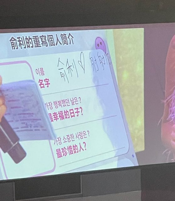 己的名字「俞利」、「8月6日」,還挑戰念出中文題目。看到粉絲尖叫聲不斷,她主動加
