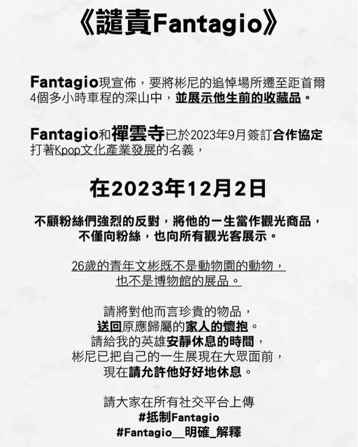Fantagio公布將文彬追悼場所「月之空間」從原有的國清寺遷至禪雲寺 粉絲們希望不應該將「月之空間」這追悼的場所搞得像是什麼觀光景點 並在推特上要求Fantagio回應並說明 (目前Fantagio無任何回應 而禪雲寺的「月之空間」已於昨日正式開放) -- ※ 發信站: 批踢踢實業坊(www.ptt.org.tw), 來自: 1.160.199.128 (臺灣) ※ 文章網址: https://www.ptt.org.tw/KoreaStar/M.1701581507.A.641