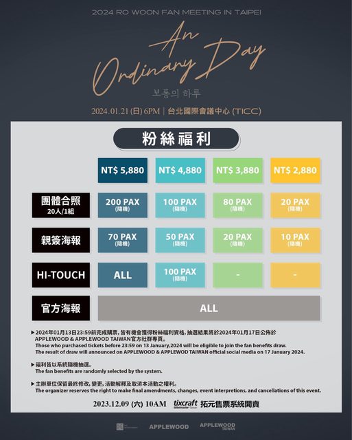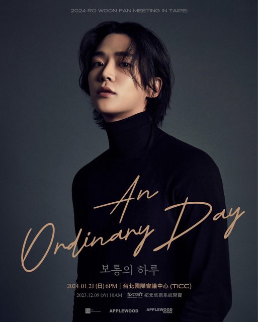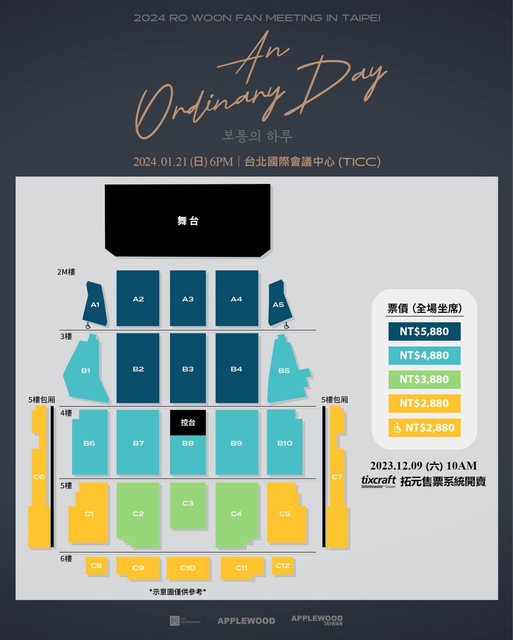 【2024 RO WOON FAN MEETING 'An Ordinary Day' in Taipei】售票資訊公告 因為想念~路雲他不聽使喚的腳,朝著台北粉絲們奔來了~~~~ 演出日期:2024/01/21 (日) 6PM (實際演出時間以現場公告為準) 演出地點:台北國際會議中心大會堂TICC 售票時間:2023/12/09(六) 10AM 線上售票: 拓元售票系統https://tixcraft.com/ 演出票價:NT$5880 / NT$4880 / NT$ 3880/ NT$2880 (全場均為劃位座席) https://i.imgur.com/9A3203f.jpg