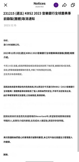 https://weverse.io/gidle/notice/16869?hl=en 以下是翻譯軟體內容,應該是團體演出取消 其他成員的合作舞台不確定還有沒有,昨天還練習到半夜 其實美國那趟大家都蠻累的,時差影響導致休息不足 更新: 預錄好像還是有看到合作舞台 說是要表演IU的LILAC,有看到薇娟雨琦的服裝 https://i.imgur.com/L3SHaJ4.jpg