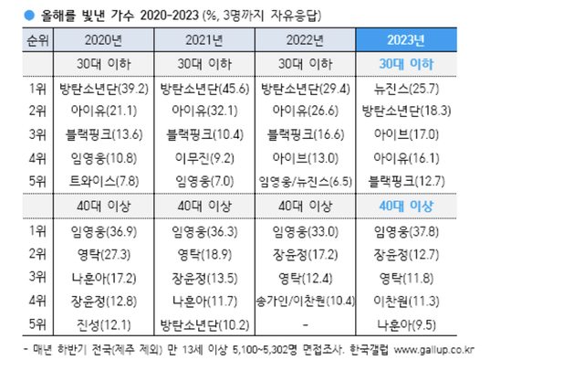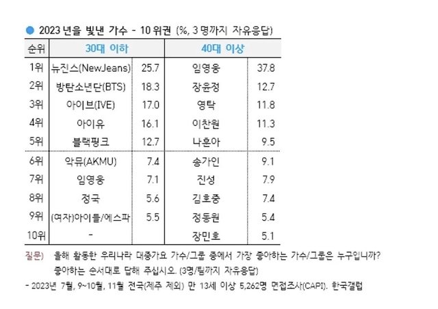 30代以下 40代以上 1. NewJeans 25.7% 林英雄 37.8% 2. BTS 18.3% 張允瀞 12.7% 3. IVE 17.0% 永卓 11.8% 4. IU 16.0% 李燦元 11.3% 5. BLACKPINK 12.7% 羅勛兒 9.5% 6. AKMU 7.4% 宋佳人 9.1% 7. 林英雄 7.1% 陳成 7.9% 8. 楨國 5.6% 金浩仲 7.4% 9. aespa / (G)I-DLE 5.5% 鄭東元 5.4% 10. 張民皓 5.1% ===== https://i.imgur.com/eKdlsgZ.png