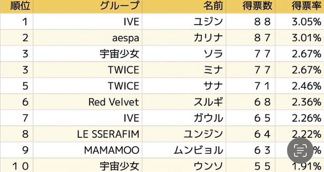 第1名 IVE 俞真 第2名 aespa Karina 第3名 宇宙少女 雪娥 第4名 TWICE Mina 第5名 TWICE Sana 第6名 Red Velvet 瑟琪 第7名 IVE 秋天 第8名 LE SSERAFIM 允真 第9名 MAMAMOO 玟星 第10名 宇宙少女 恩熙 來源: theqoo https://theqoo.net/square/3043854089 1. 又帥又美,我也喜歡 2. 雪娥、瑟琪、玟星都是固定班底了 3. Mina在日本也很受女生歡迎啊╕╕╕╕╕ 4. 雪娥我同意 5. 看到雪娥上榜就知道這個榜是真的了 6. 暈,居然沒有Winter,好驚訝 7. Mina和Sana是我的TT TT 8. 感覺Karina和Sana好像是男女都會喜歡的類型 9. 沒想到韓國和日本女同志的取向一模一樣,好神奇 10. 沒有Winter讓我有點意外,想說她應該很受女生歡迎,在日本人氣也很高 11. 沒想到沒有一葉 12. 除了Mina和Sana以外,我好像都知道是什麼感覺╕╕╕╕╕ 13. 樣本數是不是太少了 14. 日本女生和韓國女生的pick一模一樣╕╕╕╕╕╕ 15. 我從第一名開始就很同意這個榜單了╕╕╕╕╕╕ (翻譯來源:FB韓網評論翻譯站) -- ※ 發信站: 批踢踢實業坊(www.ptt.org.tw), 來自: 218.172.151.211 (臺灣) ※ 文章網址: https://www.ptt.org.tw/KoreaStar/M.1703166761.A.D9D