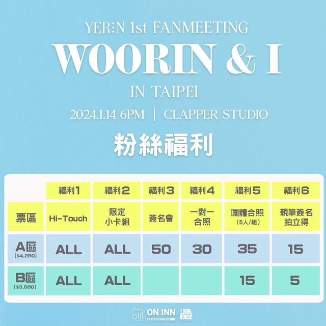 福利5與YERIN合照(5人/組)共50名:抽選A區35名,B區15名。